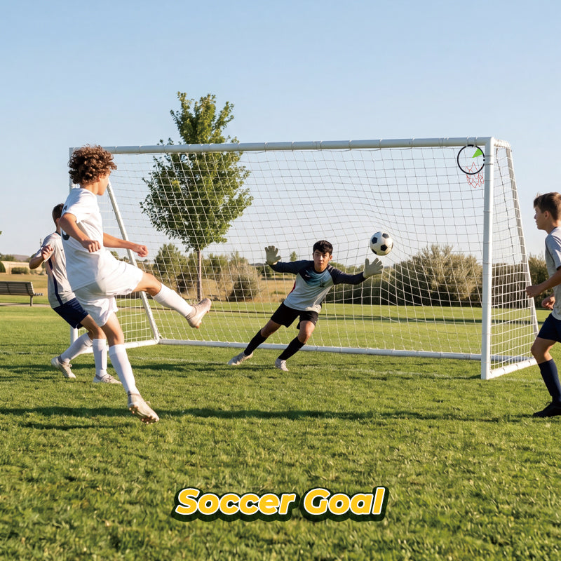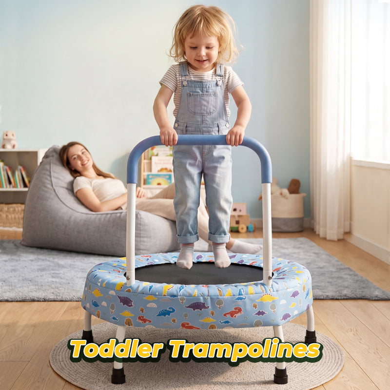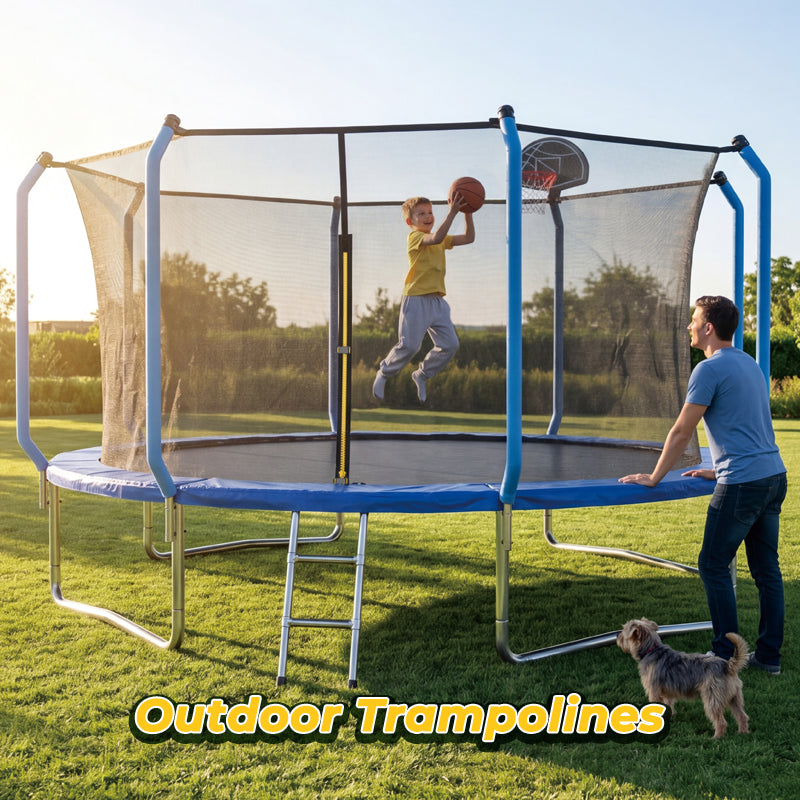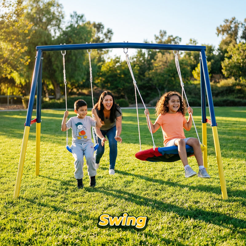 Trampolines, swings, toddler play and soccer goals for endless outdoor fun.