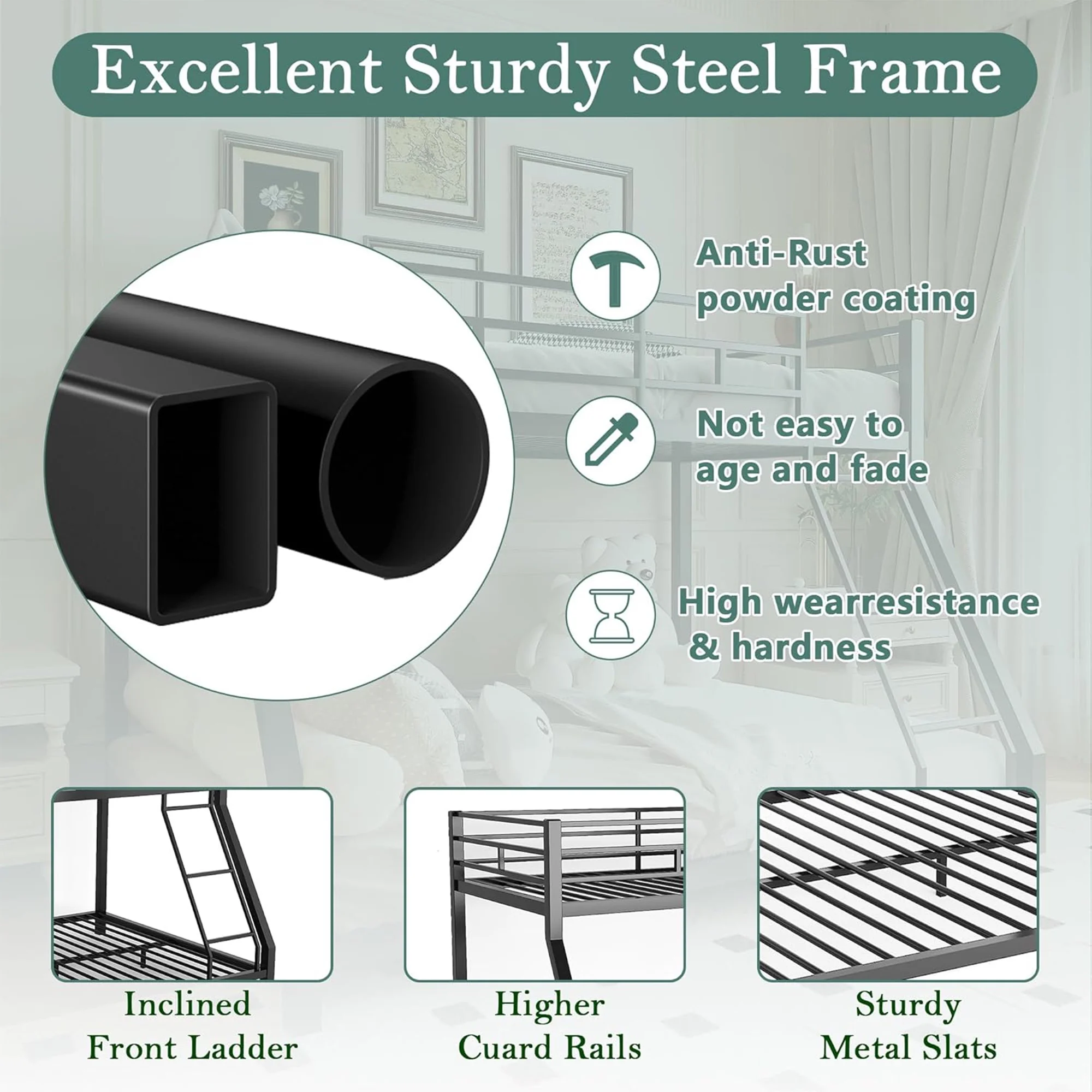 • Robust Construction: This Twin over Full bunk bed frame is crafted from heavy-duty, rust-resistant metal with thickened steel and reinforced lower bunk legs for enhanced durability and load-bearing capacity.