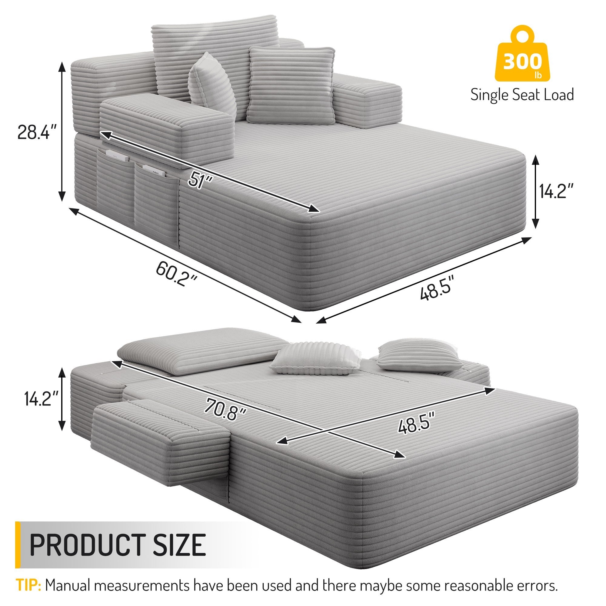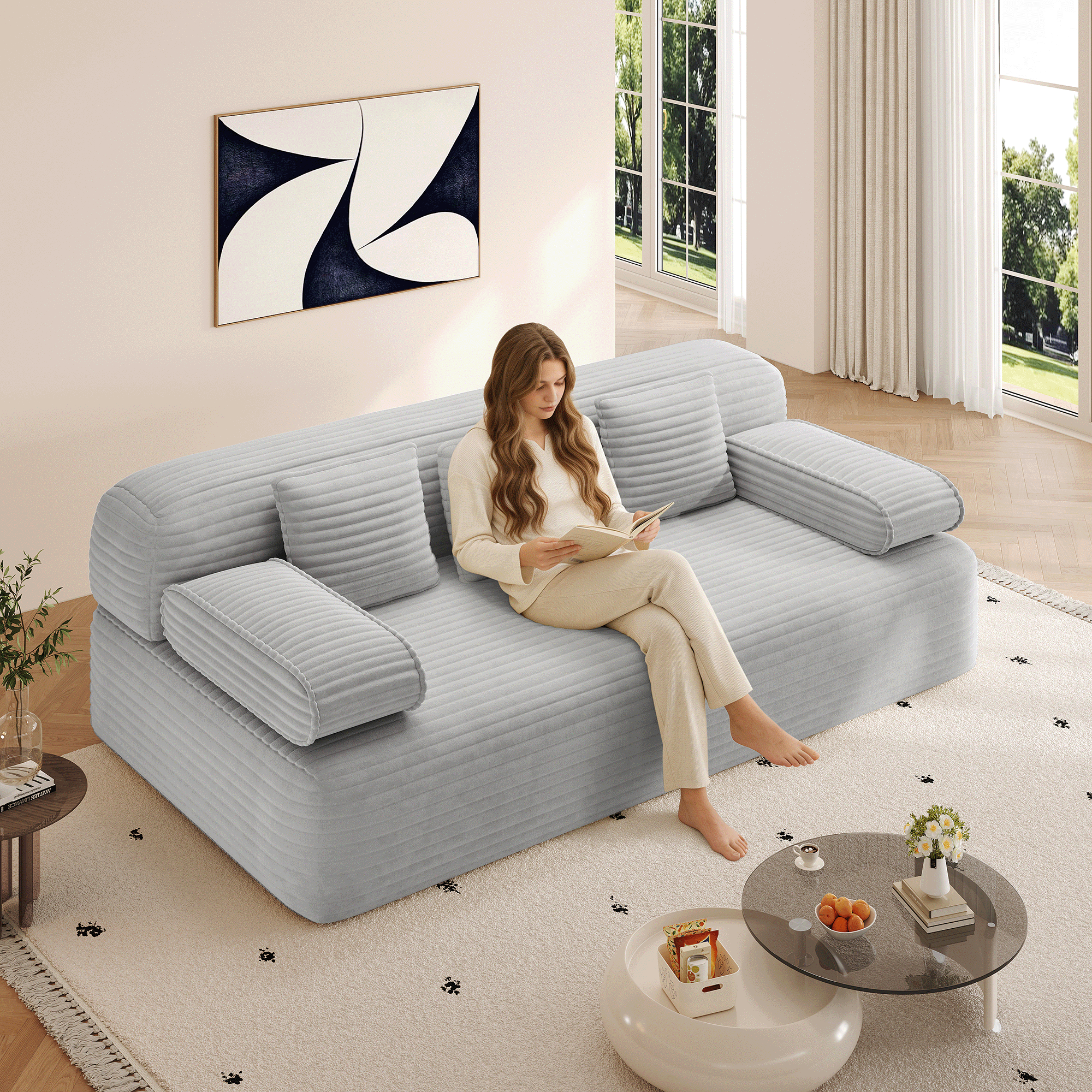 Kdymod Convertible Corduroy Sofa Couch Bed with Hidden Zipper Backrest and armrests,70.8'' Oversized Chaise Lounge Chair Indoor with 3 Pillows for Small Spaces,No Assembly Required,Light Gray
