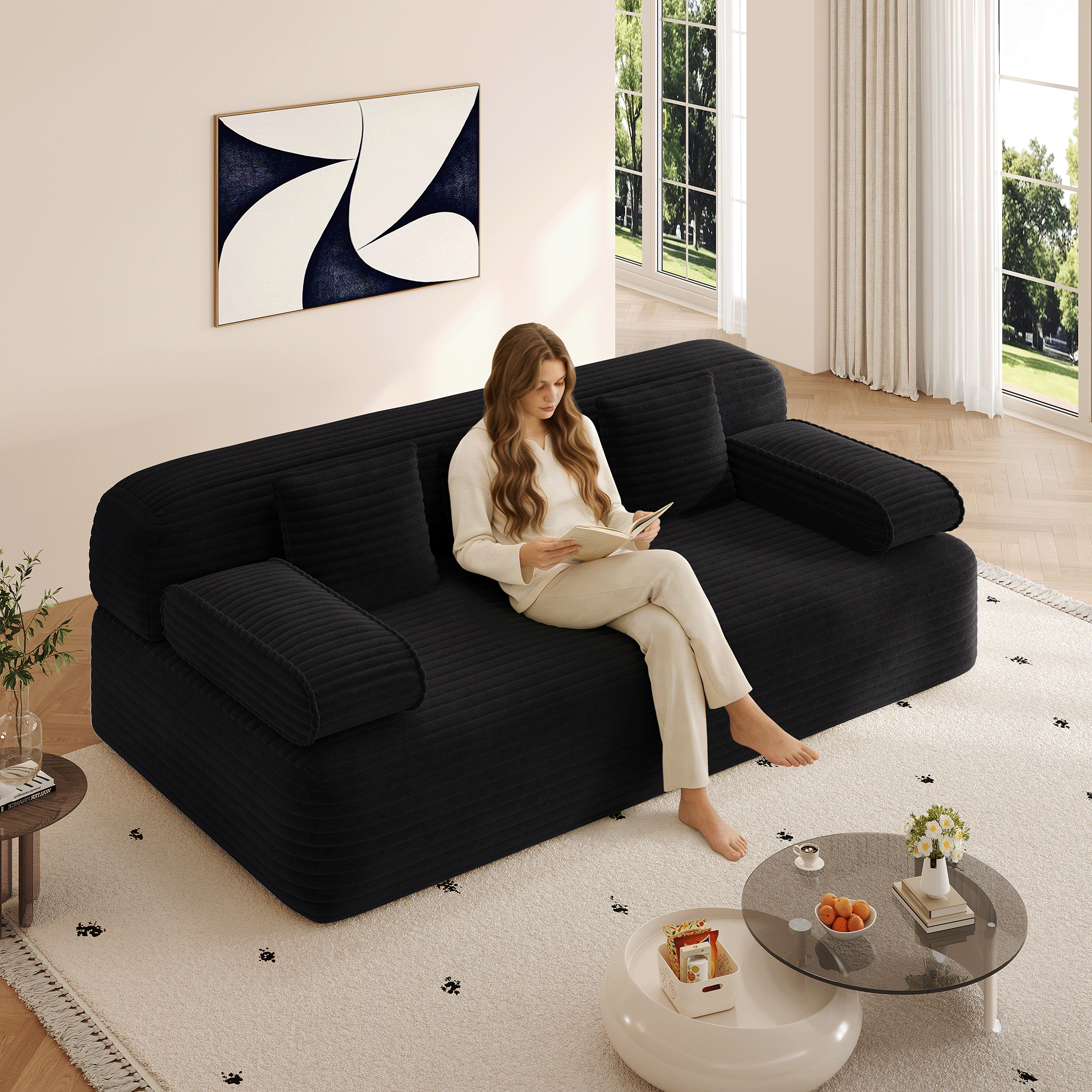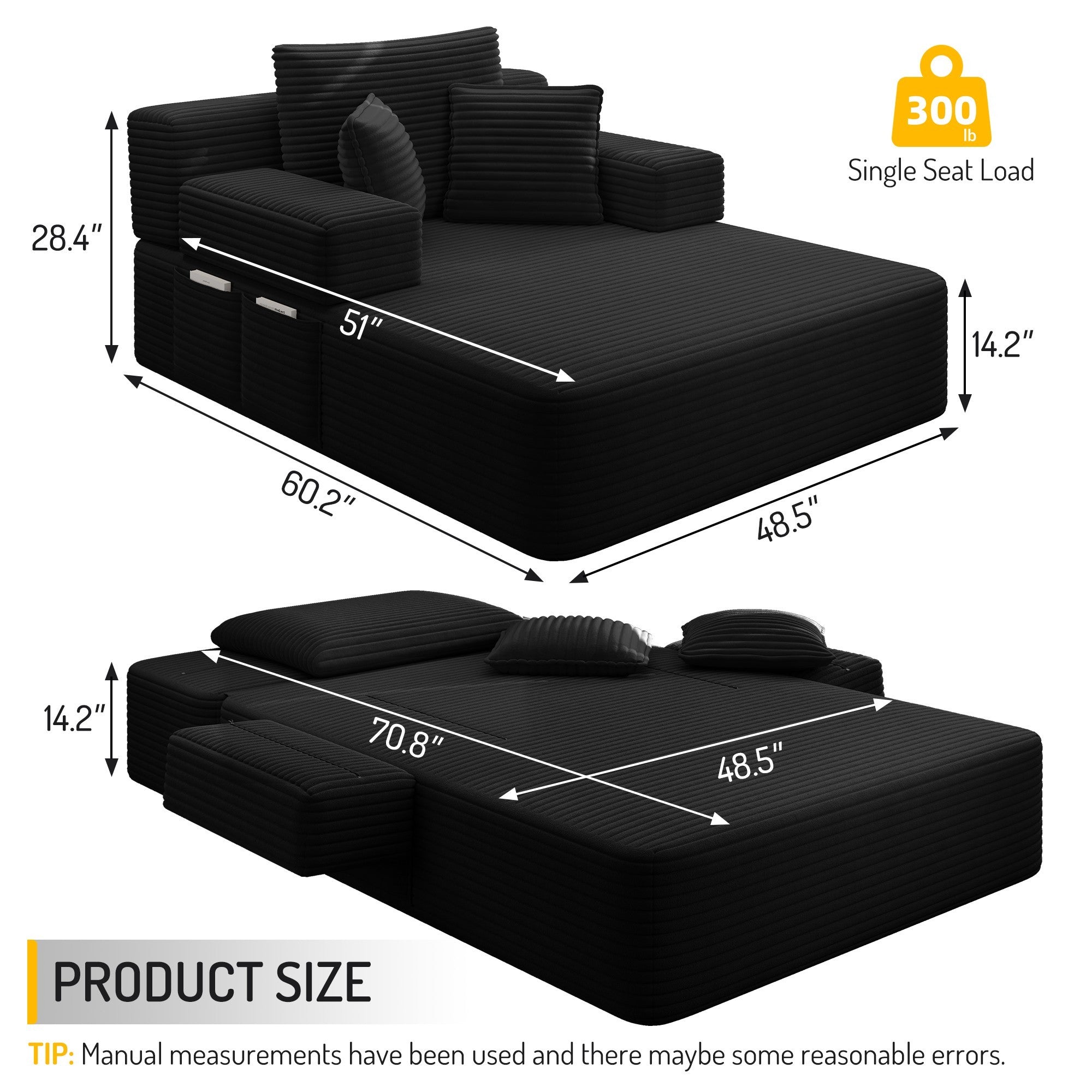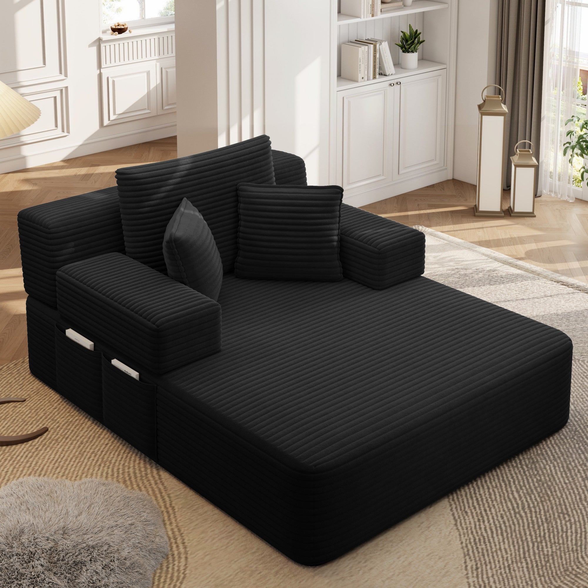 Kdymod Convertible Corduroy Sofa Couch Bed with Hidden Zipper Backrest and armrests,70.8'' Oversized Chaise Lounge Chair Indoor with 3 Pillows for Small Spaces,Living Room,No Assembly Required,Black