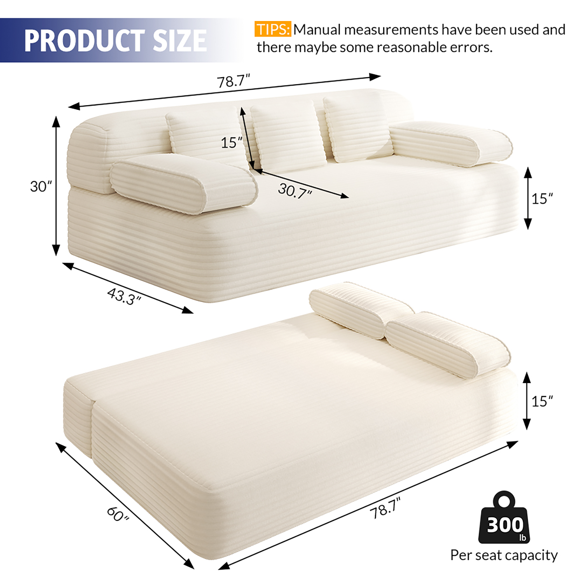 Kdymod 2-in-1 Convertible Sofa Bed with Zippered Backrest,Queen Size Boneless Sofa Couch with 3 Pillows,Cozy Corduroy Futon Couch with High Resilience Foam for Living Room,Apartment,Small Space,Beige