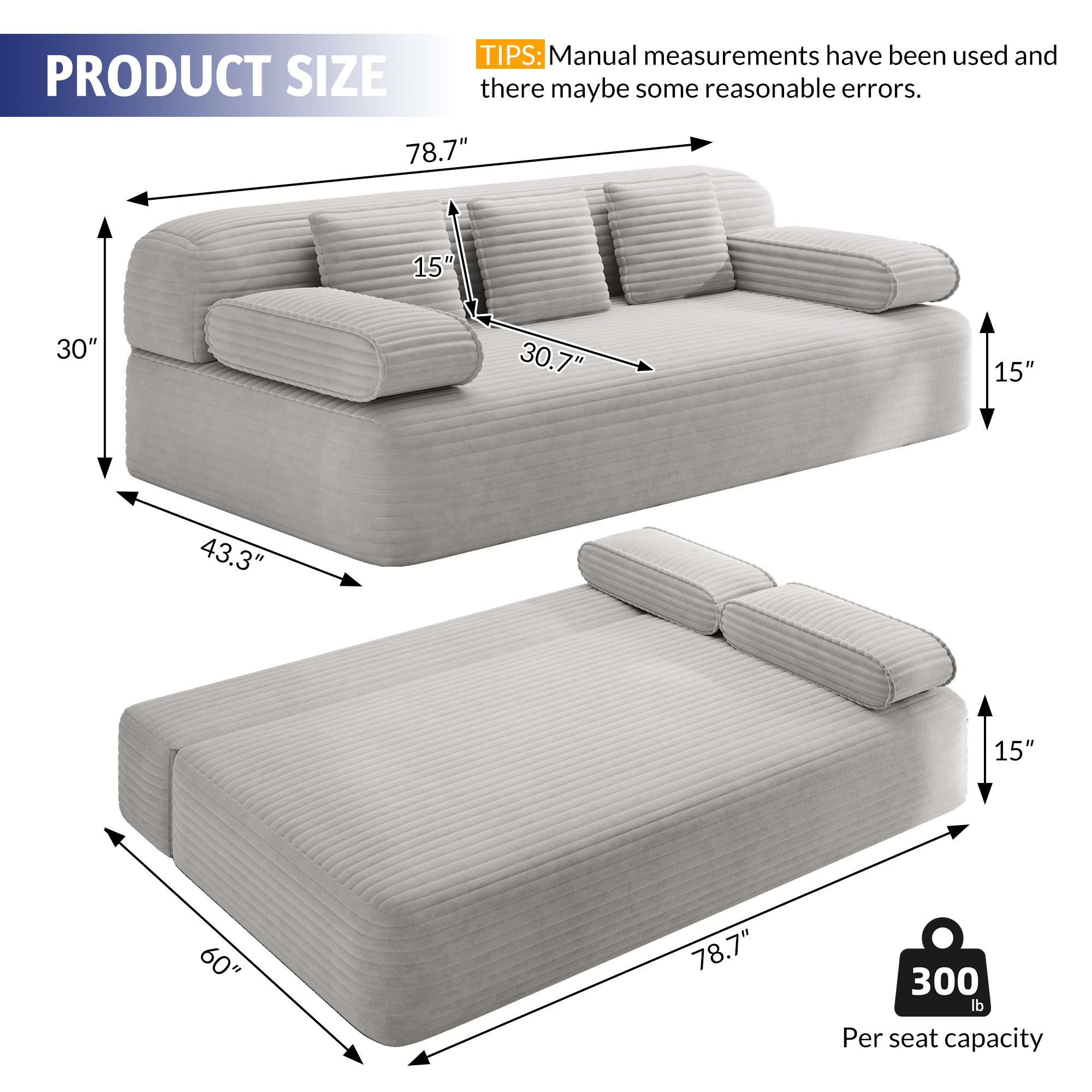Kdymod 2-in-1 Convertible Sofa Bed with Zippered Backrest,Queen Size Boneless Sofa Couch with 3 Pillows,Cozy Corduroy Futon Couch with High Resilience Foam for Living Room,Apartment,Small Space,Gray