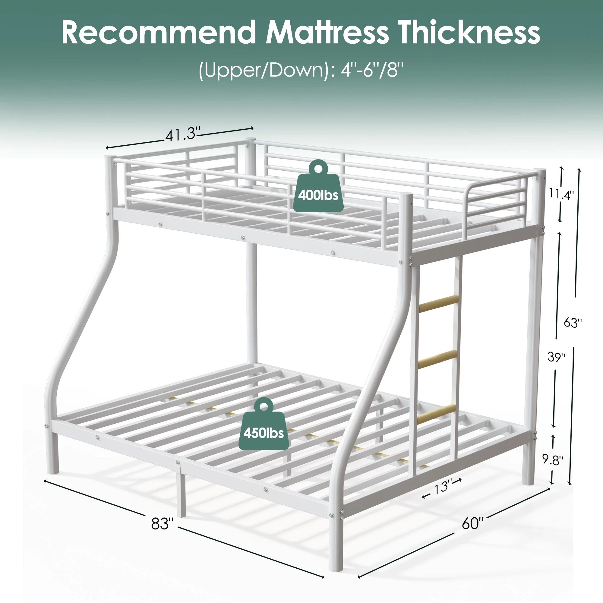 Netrum Twin XL over Queen Bunk Bed for Adults,Heavy Duty Metal Bunk Beds Frame with Wall Fastener Screws,Ladder & Full-Length Guardrail,White