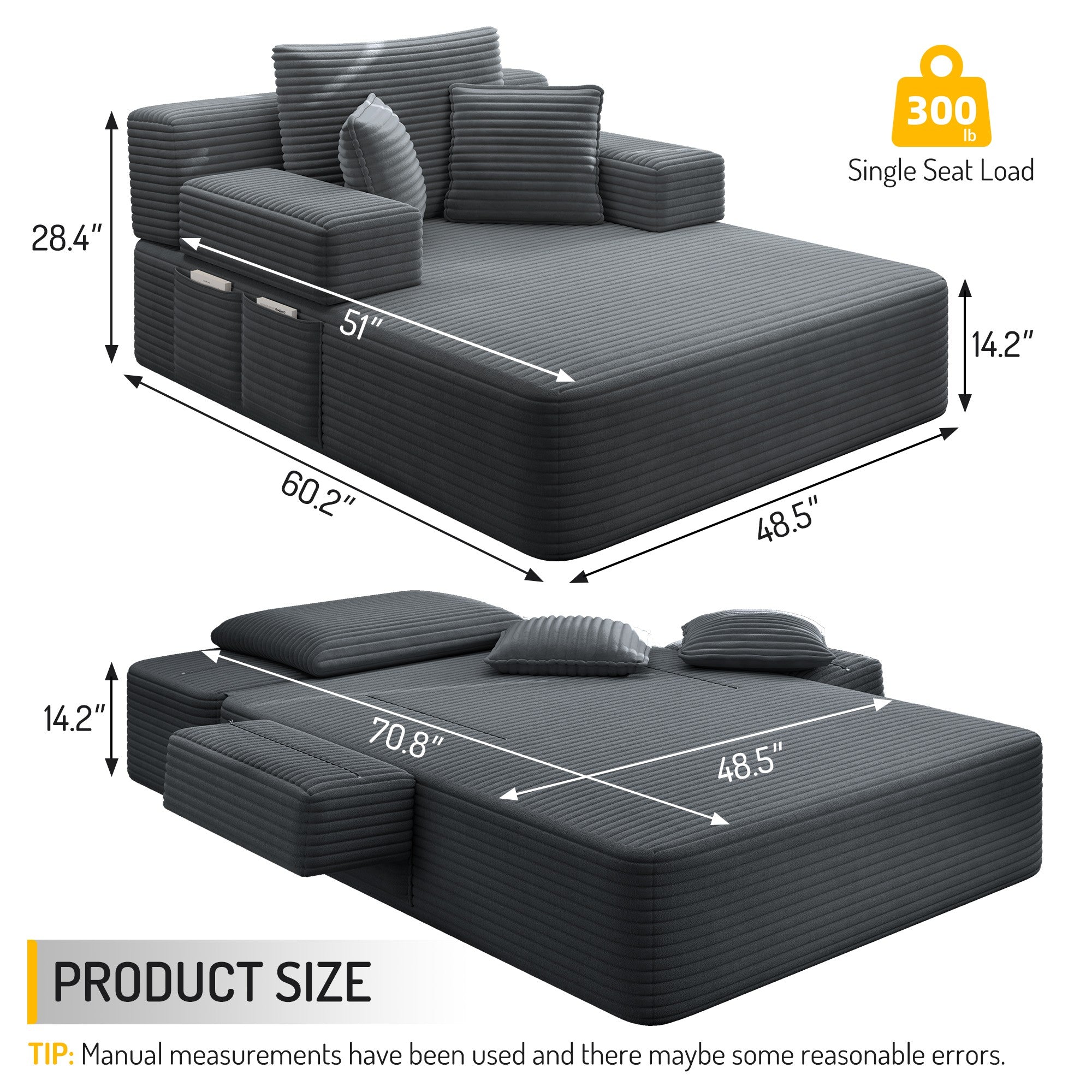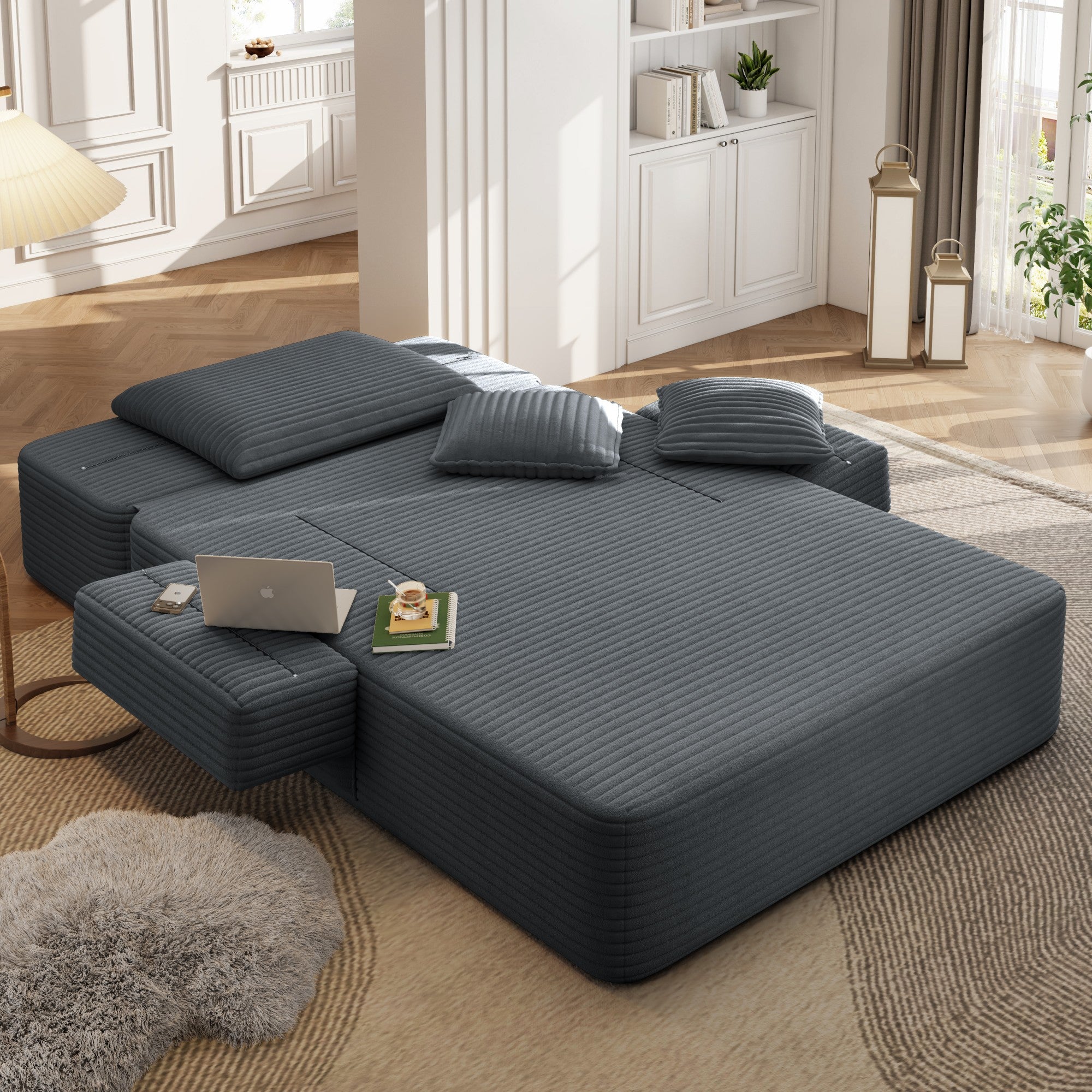 Kdymod Convertible Corduroy Sofa Couch Bed with Hidden Zipper Backrest and armrests,70.8'' Oversized Chaise Lounge Chair Indoor with 3 Pillows for Small Spaces,No Assembly Required,Dark Gray