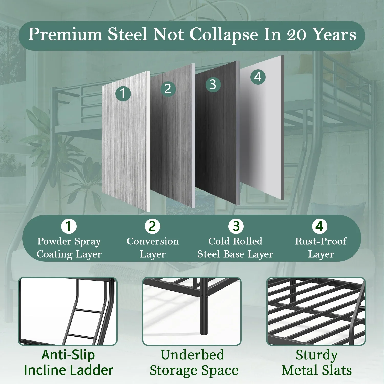 Netrum Twin over Full Bunk Bed for Adults Teens,Heavy-Douty Metal Bunk Beds Frame with Wall Fastener Screws,Ladder & Full-Length Guardrail, Black