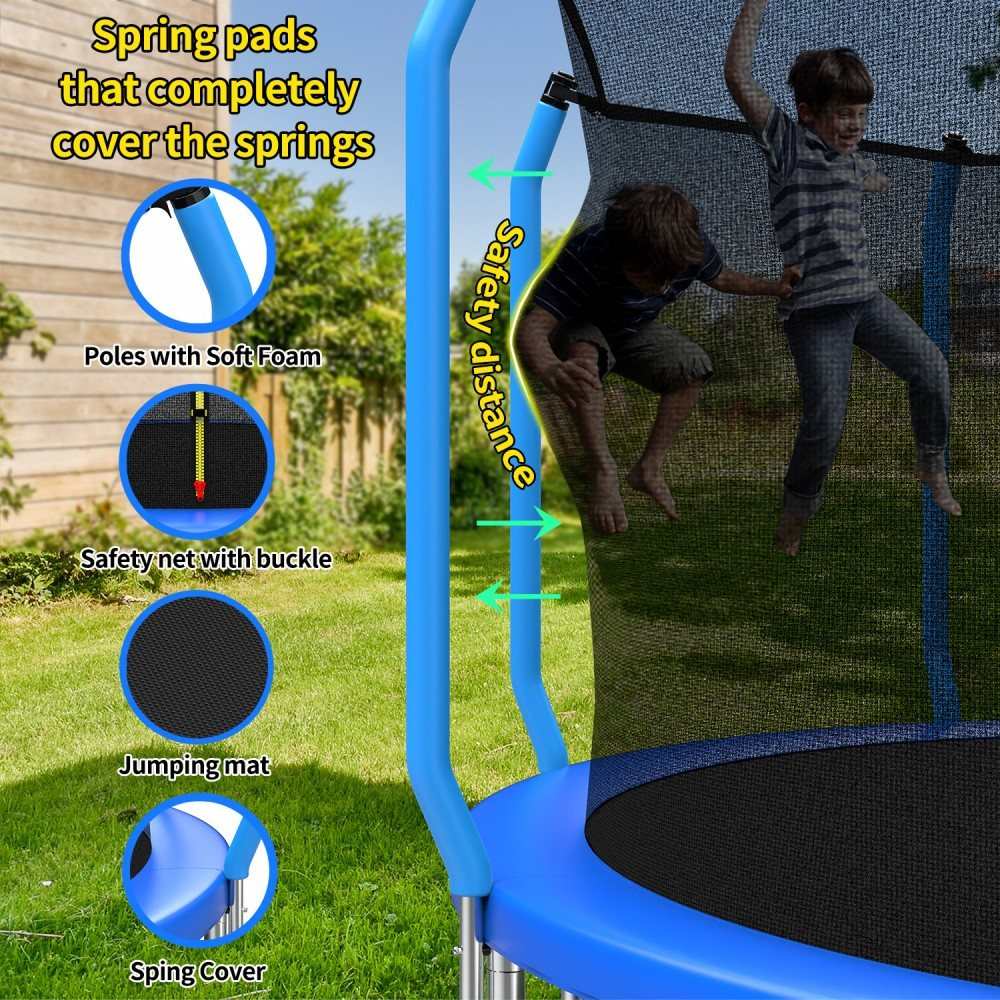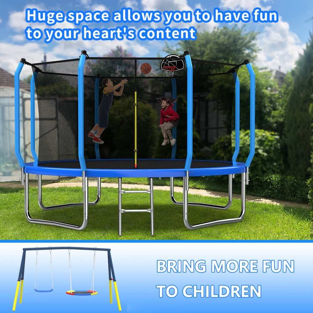 Transforme su patio trasero en un área de juegos con nuestro trampolín deportivo resistente de 12 pies de color azul. Aprobado por ASTM y equipado con un aro de baloncesto, ofrece diversión sin fin para todos y, al mismo tiempo, garantiza la seguridad. Elimine el estrés y mejore su estado físico con este complemento imprescindible para cualquier patio trasero.